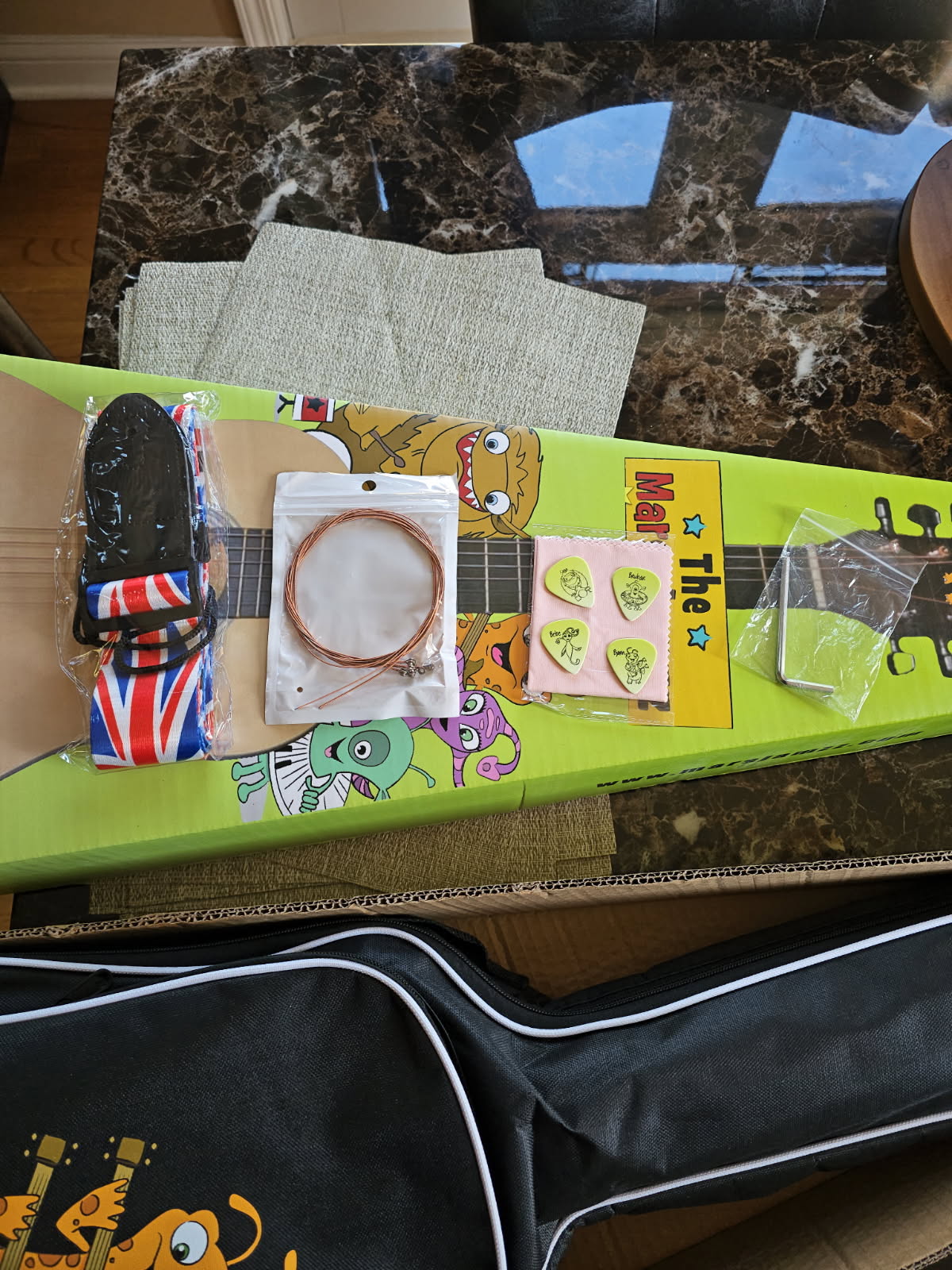 Get ready for a Guitar Lesson Extravaganza with brand new Mars Jamzz Kids Beginning Guitar Pack!!! Comes with everything you need to get Mars Jamming; 30 inch wood Kids sized Guitar with steel strings and truss rod, Guitar bag, picks, spare stings, cleaning cloth, strap and our Mars Jamzz Kids Beginning Guitar Book 1!!!!!! We use Guitar TAB as well as Standard notation so its easy for both kids and Parents to learn from quickly and easily!!! Over 20,000 books sold!!!