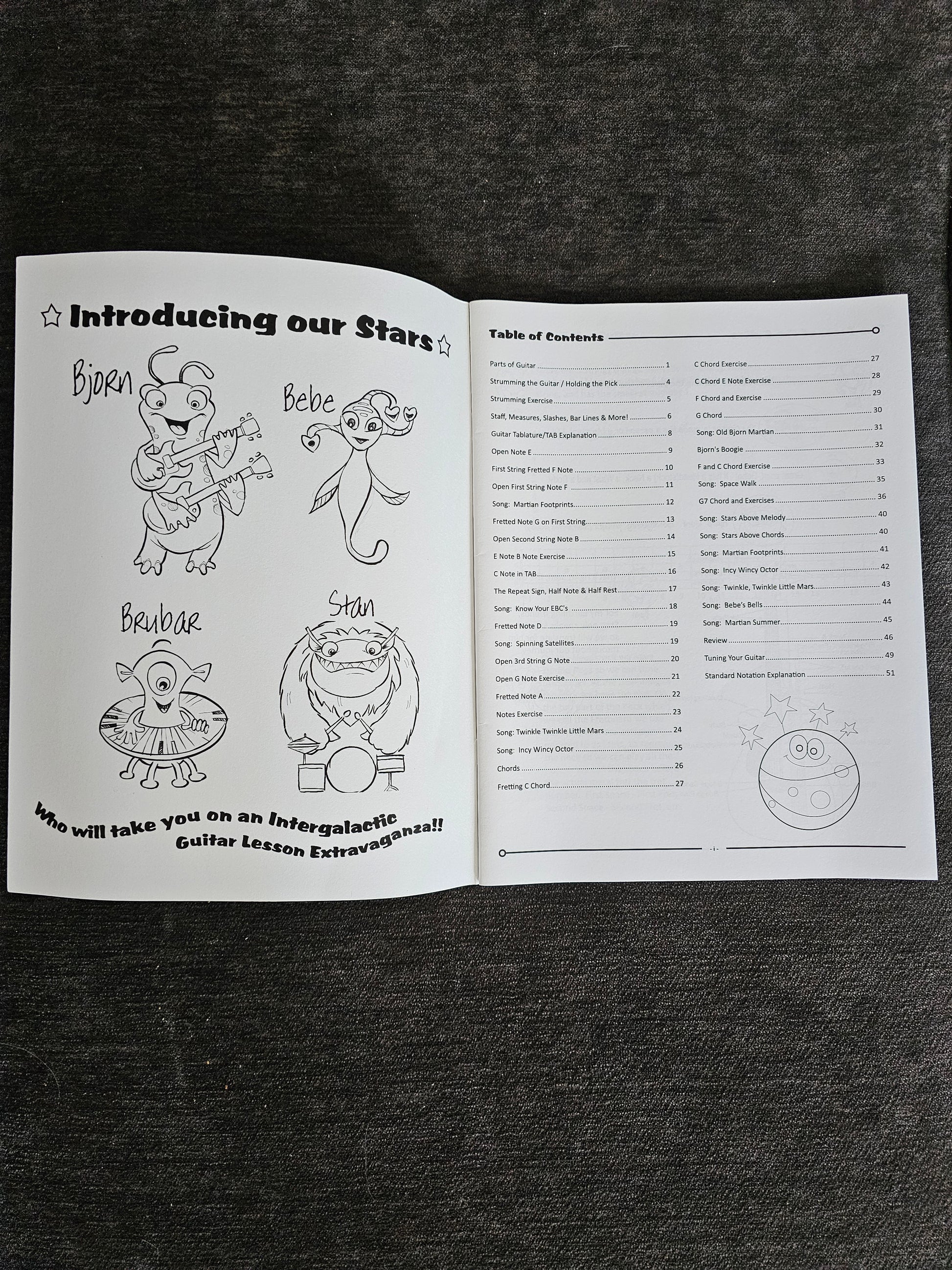 Let our Martians take you on an Intergalactic Guitar Lesson Extravaganza! Our Mars Jamzz Kids Beginning Guitar Book 1 is the easiest funnest guitar lesson book on the market! Kids (and their parents) can learn all; the parts of the guitar, the notes on the guitar, basic chords and songs on guitar and have a great time doing it. We use guitar tablature as well as standard notation for our lessons to make them quick and easy to understand for everybody.